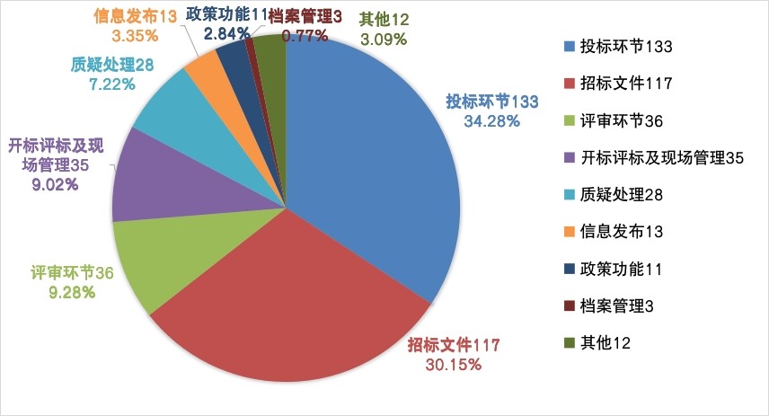 投诉处理结果公告324则,占74.65%。其中,投诉成立41,部分成立93;驳回183,部分驳回88。因投诉事项缺乏事实依据被驳回251;因投诉不符合法定受理条件、投诉无效及部分无效70;因其他原因不再审查7;投诉成立但不影响结果2(注:部分内容有交叉)。