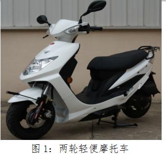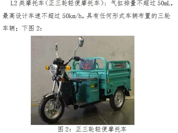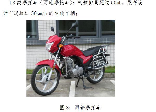 L1类摩托车(两轮轻便摩托车):气缸排量不超过50mL,最高设计车速不超过50km/h的两轮车辆;见下图1;