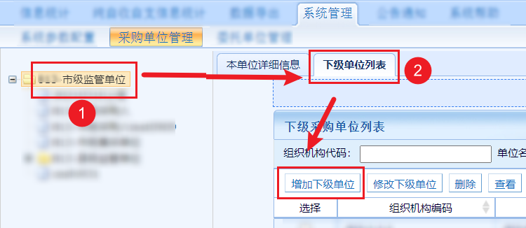 系统没有专门创建账号的功能,系统中采购单位和账号是绑定的,每家下级单位都只有一个账号并且账号也无法迁移,默认账号就是单位的组织机构代码。