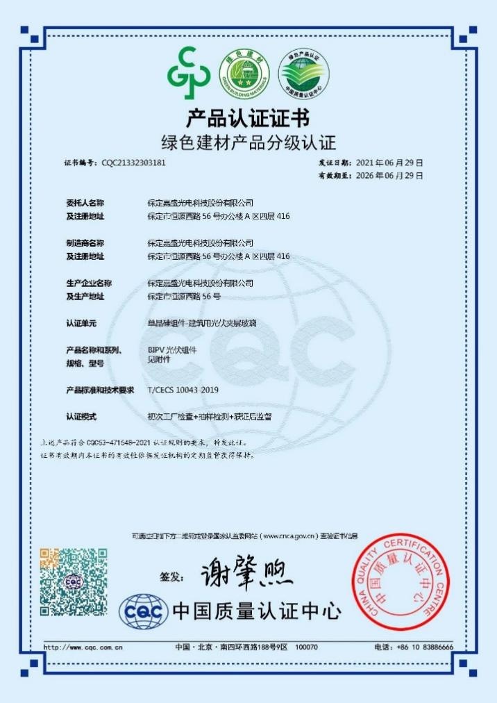6月29日,中国质量认证中心(CQC)向河北保定嘉盛光电科技股份有限公司(以下简称嘉盛光电)颁发了证书编号为CQC21332303181的绿色建材产品认证证书,该证书是BIPV行业的第一张绿色建材认证证书。这标志着BIPV产品从此有了更加规范的认证管理,无疑将助推BIPV技术及光伏绿色建材产品在建筑上的广泛应用,助力“双碳”目标在建筑行业更快速的实现。