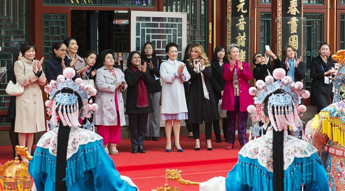 德和园中的大戏楼前,彭丽媛与出席2014年APEC领导人非正式会议的部分经济体领导人或代表的夫人一起欣赏了根据名画《簪花仕女图》设计改编的宫廷乐舞《炫舞羽音》和京剧名段串编《巾帼风采》。墨西哥总统夫人里韦拉还试着弹奏了中国传统民族乐器箜篌。