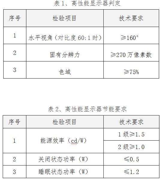 能同时满足(1)对比度在60:1时,水平视角不小于160°,(2)固有分辨力不低于270万像素数,(3)色域不小于75%等三个条件的显示器。节能认证的高性能显示器详见表1、表2要求: